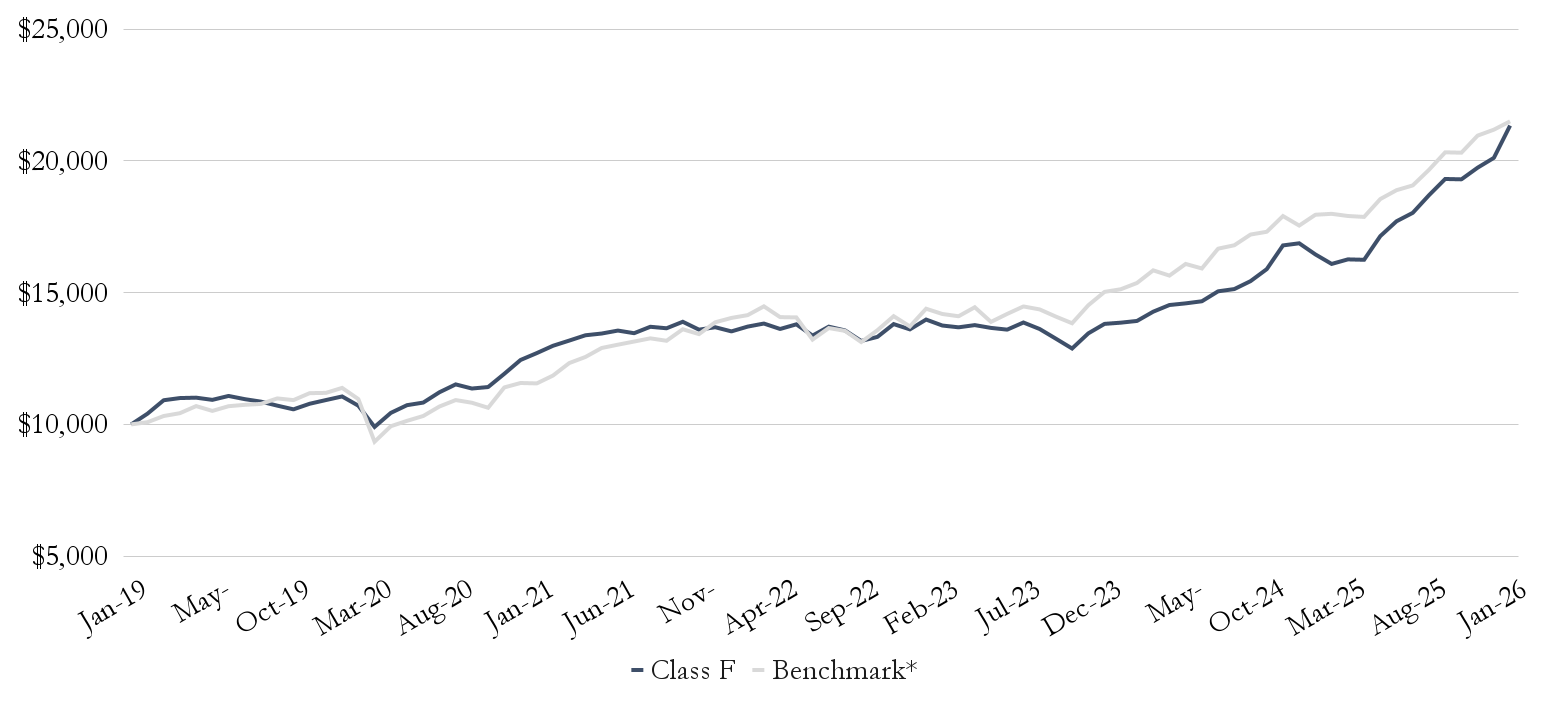 | Benchmark | 0.66% | 1.57% | 3.12% | -1.26% | 2.83% | -1.07% | 4.72% | 0.77% | 2.42% | 0.61% | 3.45% | -2.02% | 16.75% | |